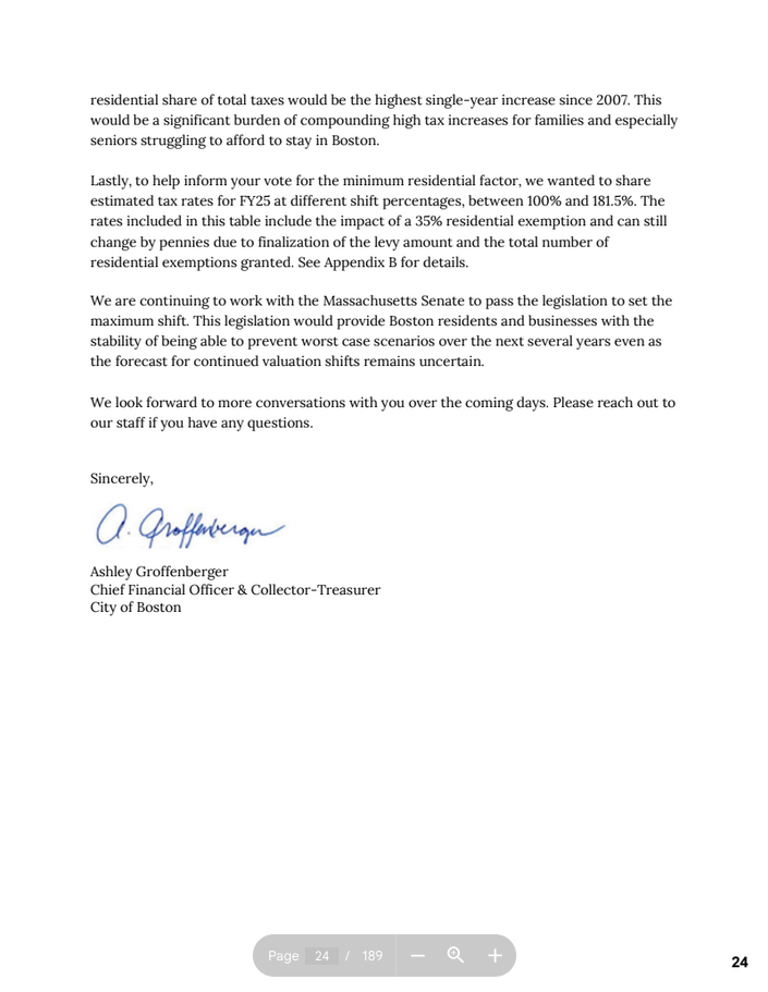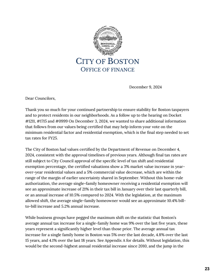Exactly when those details will become public is not clear: last year the hearing for this docket was held before the state certified Boston’s property values. That meant the Council learned about the tax rates they would be voting on via letter from CFO and Treasurer-Collector Ashley Groffenberger - find it on p. 23-24 of the 12/11/24 Agenda Packet.