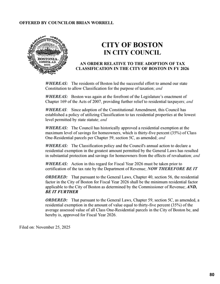 This year the tax rates are being set by Docket #2045, an “order relative to the adoption of tax classification in the City of Boston in FY 2026.” As is the Council’s tradition, the docket was offered by the Ways & Means Chair, Brian Worrell - find it on p. 80 of the 12/03/25 Agenda Packet.